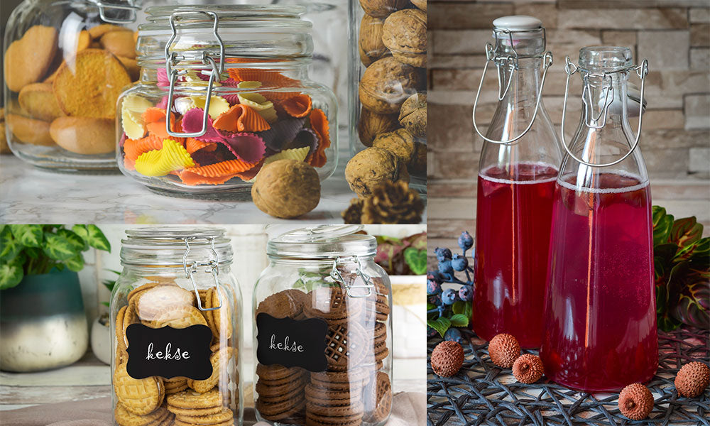 Einmachgläser und Flaschen mit Bügelverschluss.